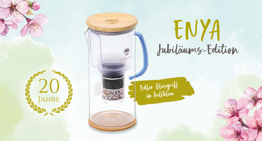Zum 20-jährigen Bestehen präsentiert LOTUS VITA eine limitierte Jubiläums-Edition der ENYA Filterkanne mit einem edlen Glasgriff in Hellblau. Diese Sonderausführung verbindet die bewährte NATURA PLUS® Filtertechnologie mit einem exklusiven Design.