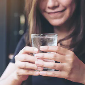 Eine junge Frau trinkt mit geschlossenen Augen genussvoll ein Glas klares Wasser.